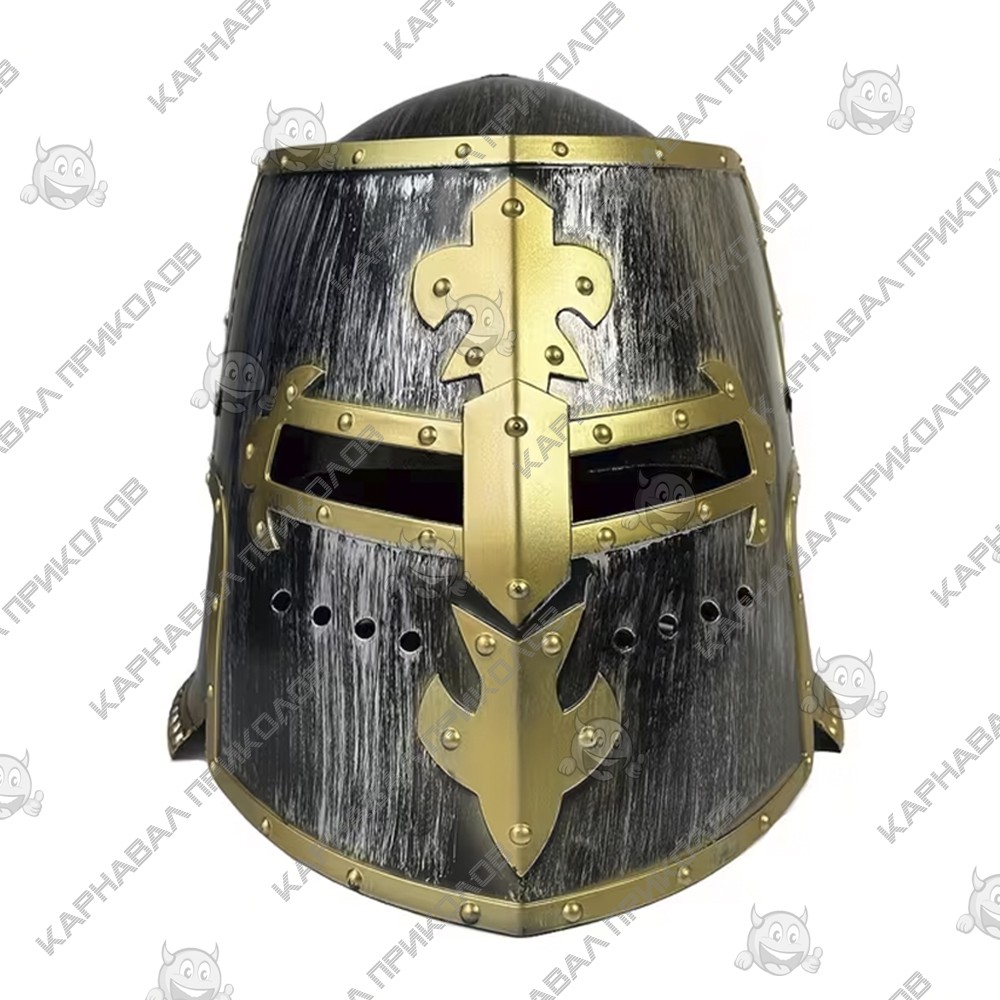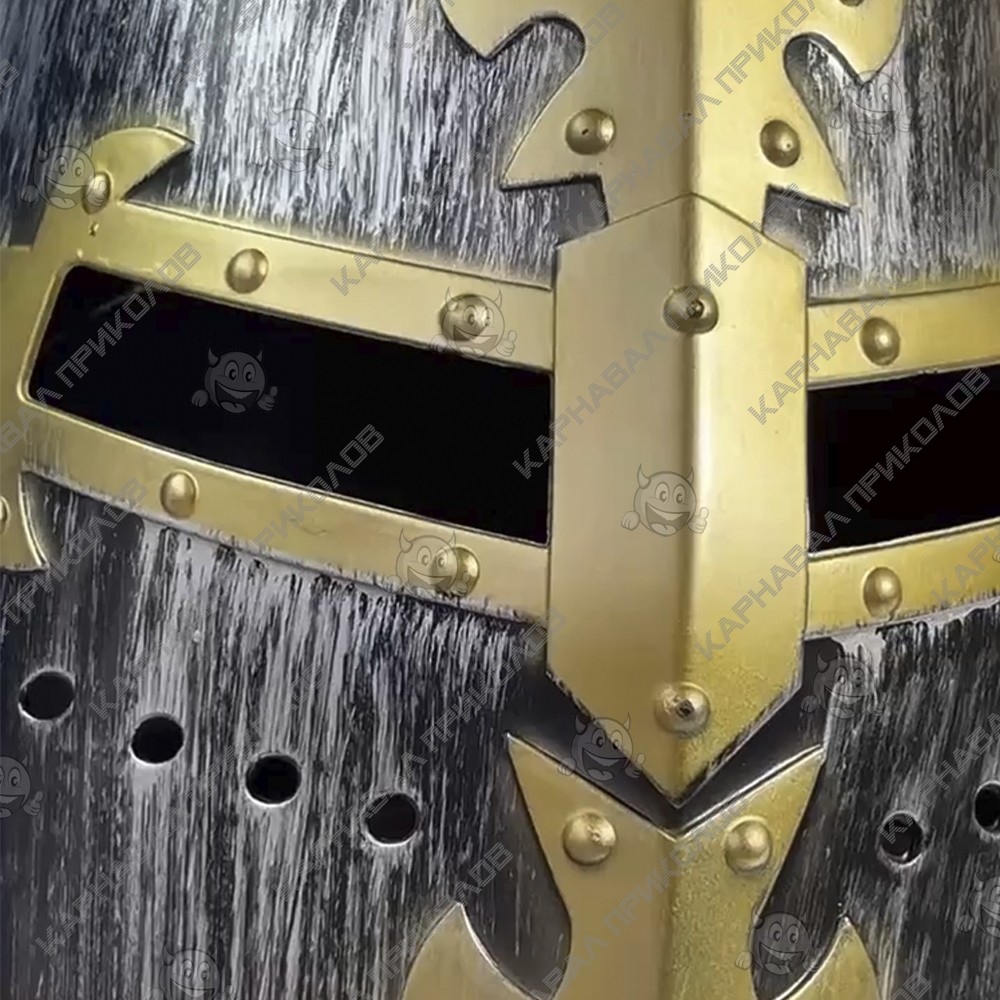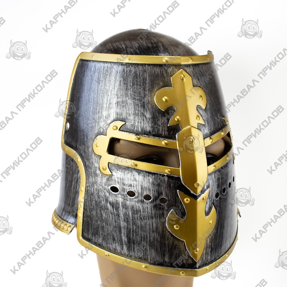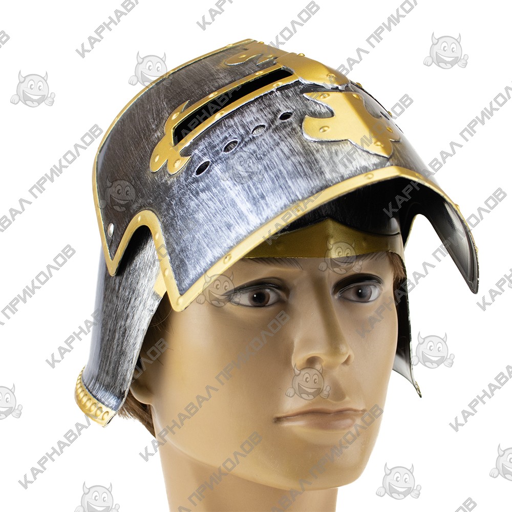 Шлем с поднимающимся забралом. Забрало декорировано орнаментом с прорезями для глаз. Отличный головной убор, который прекрасно подойдет к Вашему костюму римского легионера. Шлем Рыцаря Крестоносца — карнавальный аксессуар, в котором каждый почувствует себя смелым и храбрым воином. Это традиционная каска, которую носили рыцарир крестоносцы еще во времена средневековой империи. Шлем прекрасно дополнит карнавальный костюм средневекового.