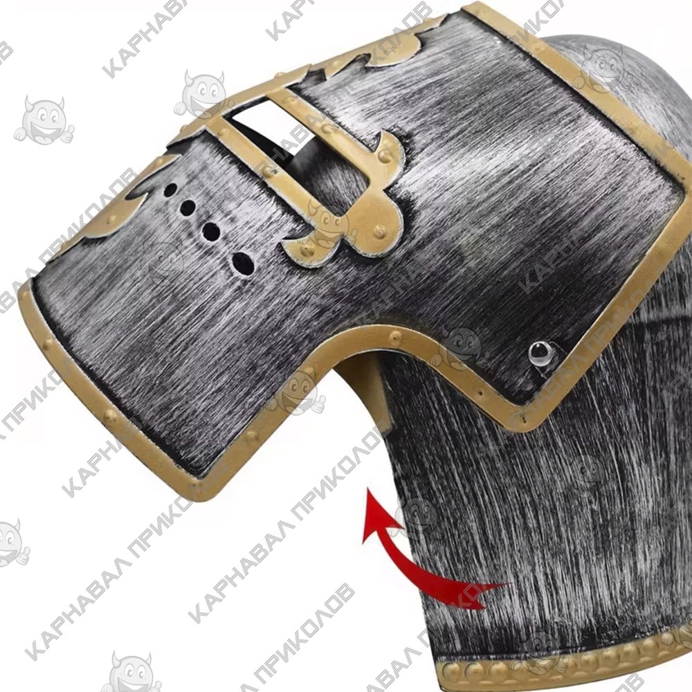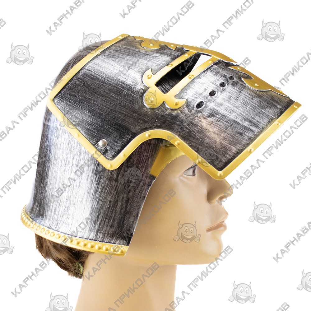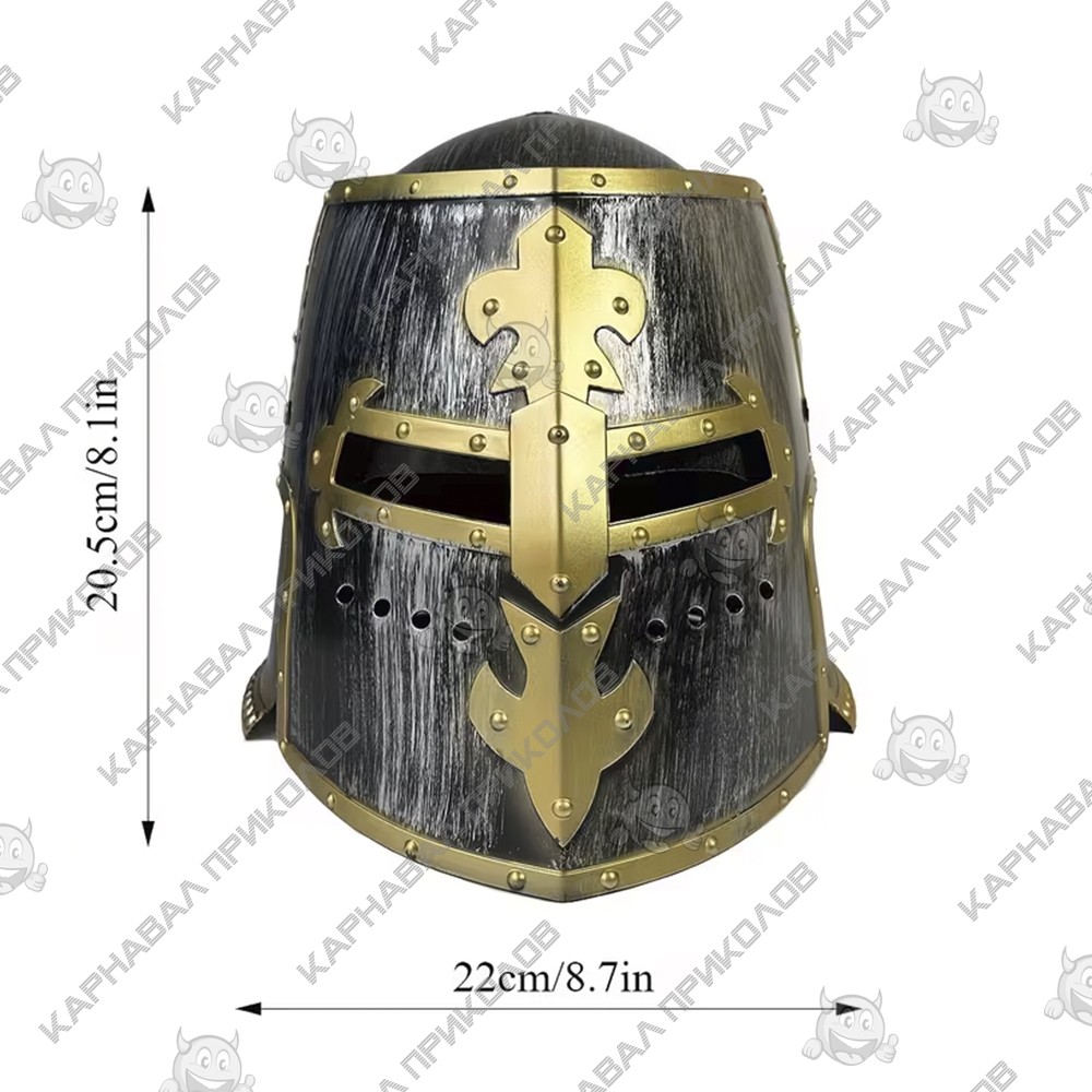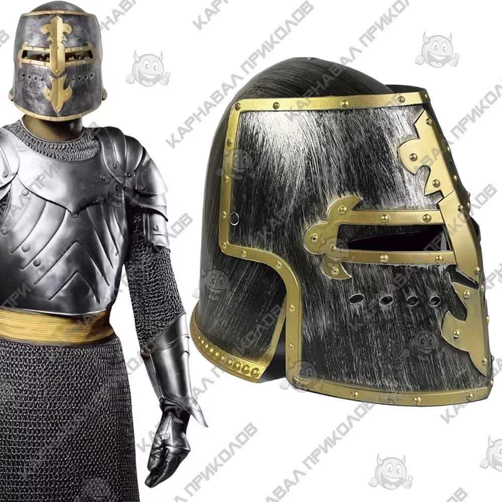 Шлем с поднимающимся забралом. Забрало декорировано орнаментом с прорезями для глаз. Отличный головной убор, который прекрасно подойдет к Вашему костюму римского легионера. Шлем Рыцаря Крестоносца — карнавальный аксессуар, в котором каждый почувствует себя смелым и храбрым воином. Это традиционная каска, которую носили рыцарир крестоносцы еще во времена средневековой империи. Шлем прекрасно дополнит карнавальный костюм средневекового.