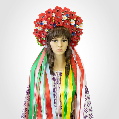 Український вінок високий зі стрічками на голову Богуміла 13695 13695 виконаний зі штучного листя, травинок, штучних великих червоних півоній та гілочок калини різних розмірів. Український вінок із квітів і стане чудовим доповненням українського образу для фотосесії. Незважаючи на об'ємність, етнічний віночок дуже легкий. Виготовлений на міцній основі (каркасі із дроту), тому добре тримає форму, розмір регулюється за допомогою стрічки ззаду. Висота корони по центральній частині 13 см. Кріплення – стрічка (під волоссям). Виготовлення Український вінок високий зі стрічками на голову Богуміла 13695 13695 провадиться нашими майстрами на замовлення в строк від 1-го до 3-х робочих днів. Пишний український вінок чудово підійде для фотосесії, дефіле, будь-якого виступу на сцені, етнофестивалю, зйомок фільму чи кліпу. Ми пропонуємо Вам купити прикрасу для волосся з авторської серії Handmade корон в українському національному стилі в інтернет-магазині Карнавал Приколов та поринути в атмосферу етнічного свята. Будьте у тренді – доповніть свій образ гарним аксесуаром, який Ви можете підібрати на нашому сайті. Компанія Карнавал Приколов залишає за собою право вносити зміни до технічних характеристик, кольору, комплектації та конструкції, що не погіршують експлуатаційних характеристик виробів, без попереднього повідомлення. Зображення та колір представленого товару можуть незначно відрізнятися від оригіналу продукції, залежно від роздільної здатності та налаштувань монітора, а також умов освітлення під час зйомки.