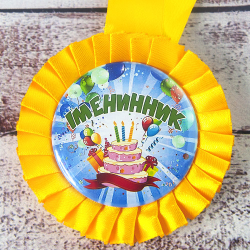 Що подарувати на іменини? Який подарунок підійде на день народження? Замовте на нашому сайті забавну прикольну Медаль Іменинник, саме такі приколи привносять в атмосферу святкування неповторні нотки індивідуальності. Почесні нагороди кріпляться на яскравій жовтій стрічці, на самій медалі перемежовуються світлі та темно-блакитні смуги. Роздумуєте, що подарувати другові? Замовляйте на нашому сайті іменинну медаль, це чудовий подарунок приятелю, колезі чи начальнику, адже день народження та іменини – найулюбленіші свята. І сувеніри, які залишаться на довгу пам'ять про свята, обов'язково викличуть посмішку на обличчі іменинника та подарують гарний настрій усім, хто запрошений на святкування. Вона кріпиться на яскраву стрічку. Медаль виконана з пластику декорована атласною стрічкою, діаметром розетки 8,5 см та діаметром жетону 5,8см, атласною стрічкою довжиною 35см. Медаль виготовляється на замовлення. Обміну та поверненню не підлягає. Напис нанесений українською мовою. Серед нашого широкого асортименту товарів, Ви знайдете безліч незвичайних та оригінальних подарунків для різноманітних заходів. Наш магазин пропонує товари оптом та для дропшиперів, ви можете оформити замовлення на сайті Карнавал Приколов та задати будь-які питання, що цікавлять менеджеру, замовивши дзвінок на нашому сайті.