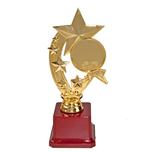 Статуетка 57002 Зірковий час чудовий та оригінальний подарунок. Подарункова статуетка виконана у вигляді скупчення зірок, з пластику з покриттям під золото на стійкій підставці, такий сувенір стане чудовою прикрасою інтер'єру і подарунком, що запам'ятовується. Статуетка упаковується в індивідуальний тубус з прозорого пластику. Унікальне пакування розроблене компанією Карнавал Приколів. На статуетках також можна виконати друк індивідуального напису з діаметром жетону 50мм. Колір тла: синій, червоний, зелений. Також виготовляємо індивідуальний друк напису на табличці для п'єдесталу Кубків та Статуеток розмірами: 5. 2х3. 5см (колір тексту – чорний, фон – золотий). На бордовому п'єдесталі статуетки може бути присутня імітація мармурових розлучень. Наш магазин пропонує товари оптом та для дропшиперів, ви можете оформити замовлення на сайті Карнавал Приколів та задати будь-які питання, що цікавлять менеджеру, замовивши дзвінок на нашому сайті.