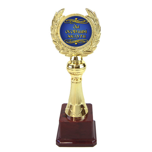 Статуетка 57156 За особливі заслуги Лавровий вінок укр - чудова та оригінальна нагорода співробітникам чи колегам за особливі заслуги. Подарунок символічний і незвичайний, який говорить як дорогий для Вас вітається! Статуетка виготовлена у вигляді 3D композиції. Фігурка виконана золотим кольором на класичному бордовому п'єдесталі. Статуетка упаковується в індивідуальний тубус з прозорого пластику. Унікальне пакування розроблене компанією Карнавал Приколів. На бордовому п'єдесталі статуетки може бути присутня імітація мармурових розлучень. Оригінальні нагороди та призи в наявності та на замовлення – відмінна ціна. Великий вибір кубків, медалей та нагородних статуеток для будь-якого приводу в інтернет магазині Карнавал Приколів.