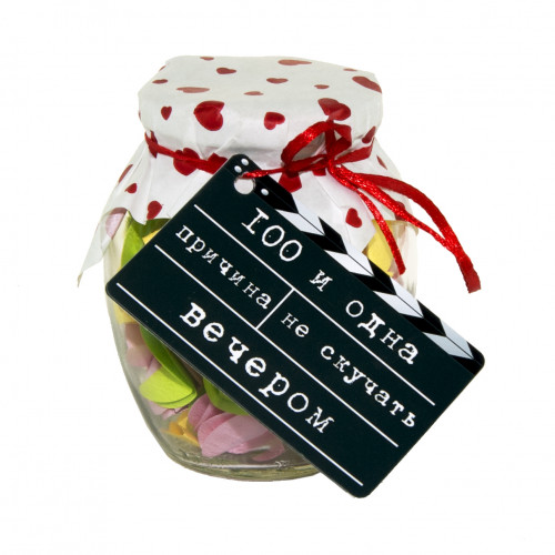 100 і Одна Можливість не нудьгувати ввечері (рос.)- ретельно відібраний нашими фахівцями з яскравих емоцій. Баночка допоможе Вам щодня радувати близьку Вам людину теплими словами кохання. Такий дивовижний сюрприз можна подарувати на день народження або піднести на День сміху або День дурня. Розгортаючи фантики, вимовляйте Подивитися фільм… Зрозуміло, Ви можете постаратися зробити таку банку своїми руками, але це забере у Вас багато часу. Щоб Ви не сиділи кілька годин, вирізуючи фантики та вигадуючи, що ж написати, ми зробили все за вас. Ви можете купити вже готову захоплюючу гру в подарунок рідним та близьким, друзям та знайомим. Інтернет магазин Карнавал Приколів пропонує купити оптом цікаві та оригінальні подарунки за низькими цінами, а також Ви можете оформити замовлення на сайті і задати будь-які запитання менеджеру, замовивши дзвінок на нашому сайті.