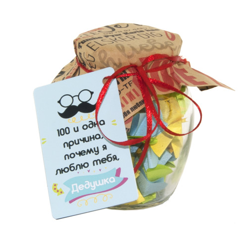 100 і Одна причина, чому я люблю тебе, дідусь (рос.) — ретельно відібраний нашими фахівцями з яскравих емоцій. Баночка допоможе Вам щодня радувати близьку Вам людину теплими словами кохання. Такий дивовижний сюрприз можна подарувати на день народження або подати на ювілей. Розвертаючи фантики, вимовляйте Ти дбайливий, Ти справедливий, Ти поважаєш мене… Зрозуміло, Ви можете постаратися зробити таку банку своїми руками, але це забере у Вас неймовірно багато часу. Щоб Ви не сиділи кілька годин, вирізуючи фантики та вигадуючи, що ж написати, ми зробили все за вас. Ви можете купити вже готову захоплюючу гру в подарунок рідним та близьким, друзям та знайомим. Інтернет магазин Карнавал Приколів пропонує купити оптом цікаві та оригінальні подарунки за низькими цінами, а також Ви можете оформити замовлення на сайті і задати будь-які запитання менеджеру, замовивши дзвінок на нашому сайті.