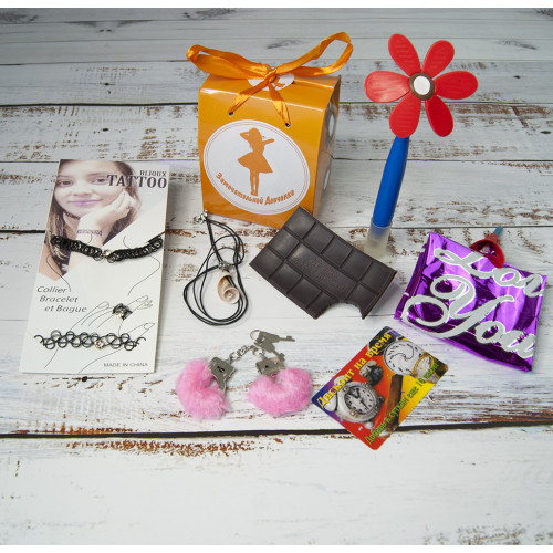 Оригінальний подарунок Чудовому дівчинці чудове доповнення подарунку на День Народження або просто сюрприз для подруги чи однокласниці. Такий цікавий подарунок можна подарувати однокласниці чи подрузі. Маленькі леді люблять все яскраве і незвичайне, і обов'язково що б було нове та незвідане. Такий дитячий набір складається з барвистої коробки з цікавими подарунками, які підкорять будь-яку дівчинку. Купивши Оригінальний подарунок Чудовому дівчиськові в нашому інтернет-магазині Ви отримуєте не тільки якісний товар, а й 100% позитивних вражень від придбання. Серед нашого широкого асортименту товарів, Ви знайдете безліч незвичайних та оригінальних подарунків для різноманітних заходів. У набір входить: Магніт Шоколадка - 1шт. , тату чокер з стразами (кольє, браслет, кільце) - 1шт. , наручники на пальці хутряні (рожеві) - 1шт. , кулон черепашка на шнурку - 1шт. , ручка Квітка з ковпачком - 1шт. . , Прикольна карта Дисконт на час - 1шт. , Кулька з паличкою (35см) Серце з мереживом - 1шт. Колір комплектуючих може відрізнятися від кольору, вказаного на фотографії.