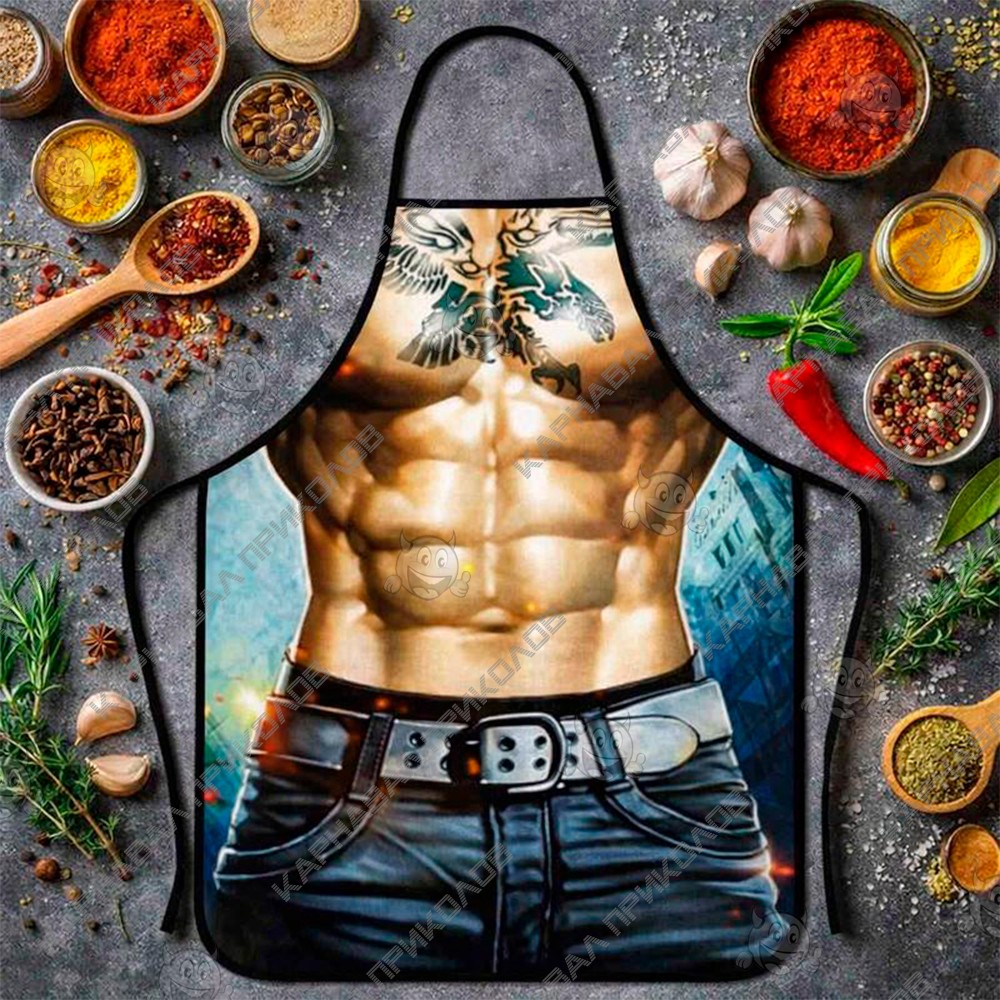 Готовы добавить немного рок-н-ролла на вашу кухню? Фартук с приколом Мачо с тату - это взрывная смесь атлетического телосложения и эффектного боди-арта. Этот аксессуар создан для мужчин, которые не боятся самовыражения и знают, что лучший маринад для шашлыка - это харизма, приправленная здоровой порцией юмора. Главная фишка модели - детализированные татуировки в стиле реализм и олд-скул, которые покрывают плечи и грудь. Рисунки выглядят настолько четко, что создается полная иллюзия настоящей нательной живописи. Как и в классической версии, здесь изображен рельефный мужской пресс и развитая мускулатура. Темные джинсы с грубым ремнем на принте дополняют образ уверенного в себе мужчины, который следит за собой и не прочь это продемонстрировать. Сочетание «суровых» татуировок и невинного занятия, такого как нарезание салата или подача десерта, создает тот самый ироничный эффект, который делает этот фартук хитом любой вечеринки. Ткань легкая и приятная на ощупь, а универсальный размер с регулируемыми завязками позволяет фартуку сесть идеально на любую фигуру. Качественная печать обеспечивает реалистичность принта.Отличный подарок для любимого,даже если в жизни он носит строгий офисный костюм, на кухне он сможет почувствовать себя настоящим королем дорог и тату-салонов. Если преподнести такой подарок на годовщину свадьбу или отношений, то оригинально подчеркнете, что мужчина всё еще тот самый горячий парень, в которого когда-то влюбилась невеста. Отличный аксессуар для тематических вечеринок, идеальный реквизит для праздников в стиле Брутальный повар или пляжная вечеринка в любое время года. Фартук с прикольным принтом Мачо с тату - это выбор для тех, кто хочет добавить образу еще больше дерзости, современности и плохого парня.