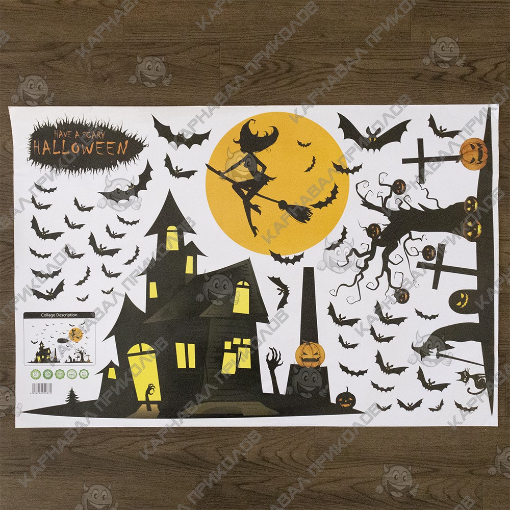 Интерьерная наклейка HL Шабаш XL891 60х90см - это быстрый способ классно украсить свой дом. Интернет - магазин Карнавал Приколов предлагает Вам купить интерьерные наклейки хоррор тематики, которые идеально подойдут на кухню, спальню, гостиную. Украшение на стену оценят в комнате страха или декора хэллоуин. Как 3D наклейка клеится на стену ? Способ поклейки очень прост. Для начала необходимо очистить поверхность, на которую необходимо наклеить. После снимаем пленку и переносим рисунок на стену или другую плоскость рукой или ветошью. На какие поверхности можно клеить интерьерную наклейку ? Поклейка возможна на любую ИДЕАЛЬНО ГЛАДКУЮ ГЛЯНЦЕВУЮ поверхность, например : стена окрашенная глянцевой краской без каких-либо рельефов ( в краске не должно быть мелового компонента), стекло, зеркало, лакированные поверхности, гладкий пластик. На обои клеить НЕЛЬЗЯ. Ухаживать за стикерами на стену также достаточно легко, для этого необходимо лишь иногда протирать их влажной губкой или тряпкой. Яркость и насыщенность наклеек не меняется с течением времени, кроме того они абсолютно устойчивы к влажности.