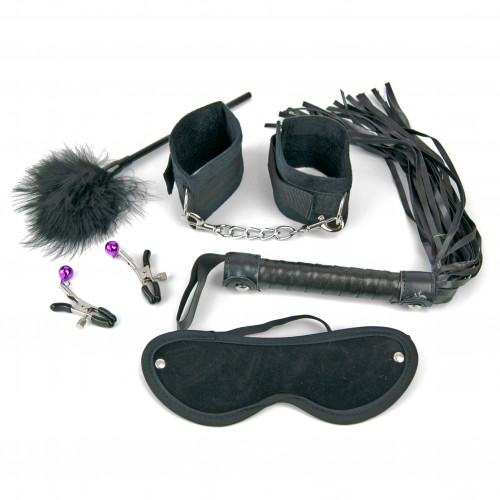 набір з 6 предметів: Плетка, маска, зажим для сосків 2шт, пір'їнка, наручники