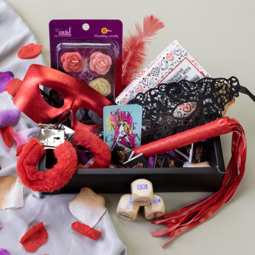 Комплектація: Пелюстки троянд, Венеціанська маска, Мереживна маска, Кубики сімейні подвійна насолода МОДЕРН(рус.), Наручники хутряні, Плеточка, Свічки чайні 6 шт, Еротична гра для дорослих 18+ АМУРНІЄТАЙНИ (рус.), мін.