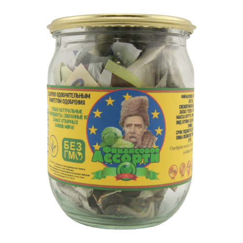 Цілі збори світових багатств! Грошовий подарунок Фінансове асорти від Карнавал Приколов - це жартівливий, але дуже актуальний презент, який демонструє різноманітність та перспективи у фінансовому світі. Усередині скляної банки ви виявите сувенірні купюри різних валют чи номіналів, складені як апетитного асорті. Етикетка з іронічним дизайном та характерним зображенням підкреслює ідею колекції світових коштів. Відмінний вибір для прагматичних мрійників та тих, хто готовий до будь-яких фінансових пригод! Шукаєте по-справжньому незвичайний подарунок, що запам'ятовується, який викличе посмішку і підніме настрій? Законсервоване Багатство. Грошовий подарунок Фінансове асорті – це дотепний та креативний спосіб вручити гроші або просто побажати фінансового благополуччя. Подарунок є скляною банкою, герметично закатаною металевою кришкою, як справжня консервація на чорний день, і наповнена сувенірними купюрами, що відповідають тематиці. Подарунок імітує домашню консервацію, але замість овочів усередині - закочені гроші, що створює кумедний та несподіваний ефект. Відмінний вибір для днів народжень, весіль, корпоративних вечірок чи просто як жартівливий презент із глибоким змістом.