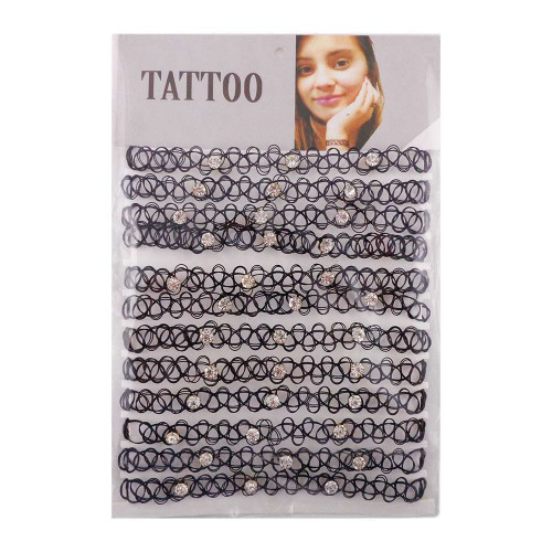 Легендарное украшение 90-х тату чокер (Tattoo Choker) снова в моде. Классический тату чокер, одевается на шею через голову, так как легко тянется благодаря резиновому своему составу, плотно пережимается к шее. Они универсальны и не требуют определенного стиля, одинаково подходят как поклонницам glam rock, так и любительницам сдержанного casual. Изготовлен из качественного пластика. В комплект входит: 12шт тату чокеров со стразами на шею.