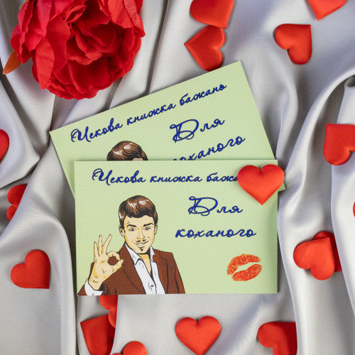 Чековая книжка желаний ДЛЯ КОХАНОГО (укр.) – самый дорогой подарок, так как Вы дарите самые бесценные вещи Любовь и Внимание. Это прекрасный и незабываемый подарок на любой праздник для Вашей половинки. С подарком Чековая книжка желаний ДЛЯ КОХАНОГО (укр.) Вы обязуетесь выполнить 15 простых, но в тоже время очень приятных квестов или желаний вашего парня в установленный период. Книжка состоит из 16 страниц, странички с подробной инструкцией по использованию и 15 дизайнерских купонов с желаниями все на русском языке. Например – в баню с друзьями, вечер видеоигр, поход на футбол и многие другие. Ваш любимый выбирает купон с желанием, а Вы должны его выполнить. В дополнение чековой книжке Вы можете приобрести сладкий сюприз и оригинальный подарок 100 и Одна Причина в нашем интернет магазине Карнавал Приколов. Купив Чековая книжка желаний ДЛЯ КОХАНОГО (укр.) вы получаете не только качественный товар, а и 100% позитивных впечатлений от приобретения.