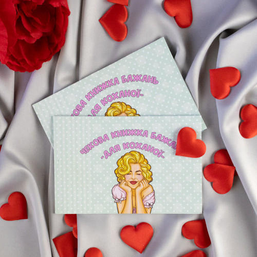 Чековая книжка желаний ДЛЯ КОХАНОЇ (укр.) – самый дорогой подарок, так как Вы дарите самые бесценные вещи Любовь и Внимание. Это прекрасный и незабываемый подарок на любой праздник для Вашей половинки. С подарком Чековая книжка желаний ДЛЯ КОХАНОЇ (укр.) Вы обязуетесь выполнить 15 простых, но в тоже время очень приятных квестов или желаний вашей девушки в установленный период. Книжка состоит из 16 страниц, странички с подробной инструкцией по использованию и 15 дизайнерских купонов с желаниями все на русском языке. Например – завтрак в постель, 100 поцелуем, приватный танец и многие другие. Ваша любимая выбирает купон с желанием, а Вы должны его выполнить. В дополнение чековой книжке Вы можете приобрести сладкий сюприз и оригинальный подарок 100 и Одна Причина в нашем интернет магазине Карнавал Приколов. Купив Чековая книжка желаний ДЛЯ КОХАНОЇ (укр.) вы получаете не только качественный товар, а и 100% позитивных впечатлений от приобретения.