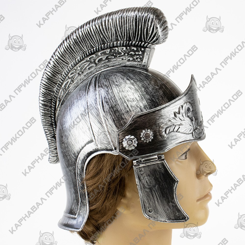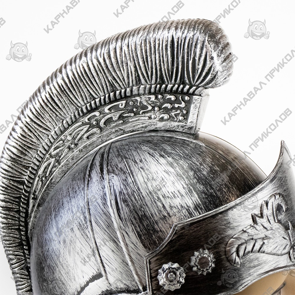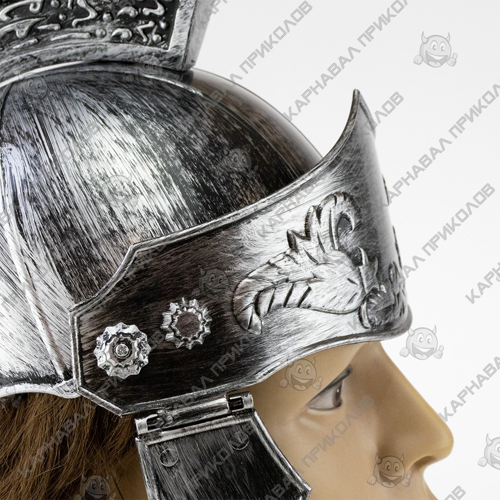 Шолом Легіонера (срібло антик) - Шолом з забралом, що піднімається, і гребенем з імітацією пір'я. Забрало декороване орнаментом. Відмінний головний убір, який чудово підійде до Вашого костюма римського легіонера чи гладіатора. Шолом римського легіонера — карнавальний аксесуар, у якому кожен відчує себе сміливим та хоробрим воїном. Це традиційна каска, яку носили офіцери легіону ще за часів Римської імперії. Ключові атрибути шолома — пластини, що захищають віскі та знаменитий гребінь, який наганяв жах на всіх, хто намагався протистояти цим сміливим воїнам у ті часи. Шолом чудово доповнить карнавальний костюм римського легіонера підійде як для костюмованої вечірки, так і для театральної постановки або тематичної фотосесії.