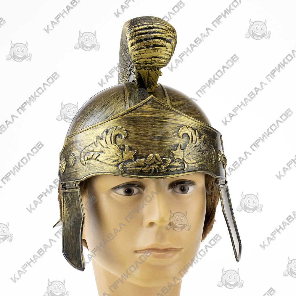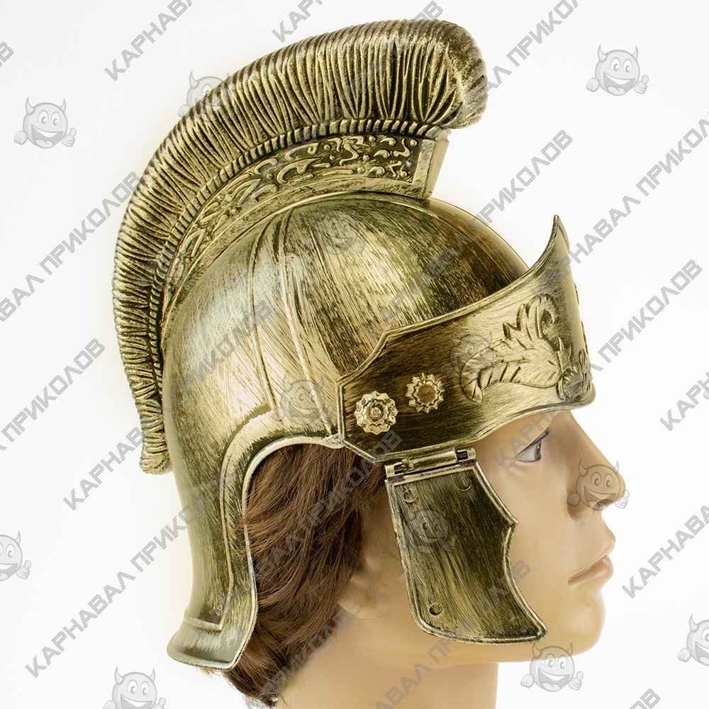 Шолом з забралом, що піднімається, і гребенем з пухом. Забрало декороване орнаментом з прорізами для очей. Відмінний головний убір, який чудово підійде до Вашого костюма римського легіонера. Шолом римського легіонера — карнавальний аксесуар, у якому кожен відчує себе сміливим та хоробрим воїном. Це традиційна каска, яку носили офіцери легіону ще за часів Римської імперії. Ключові атрибути шолома — пластини, що захищають віскі та знаменитий гребінь, який наганяв жах на всіх, хто намагався протистояти цим сміливим воїнам у ті часи. Шолом чудово доповнить карнавальний костюм римського легіонера.