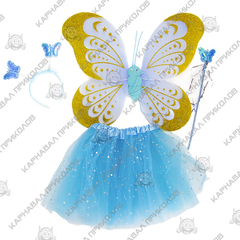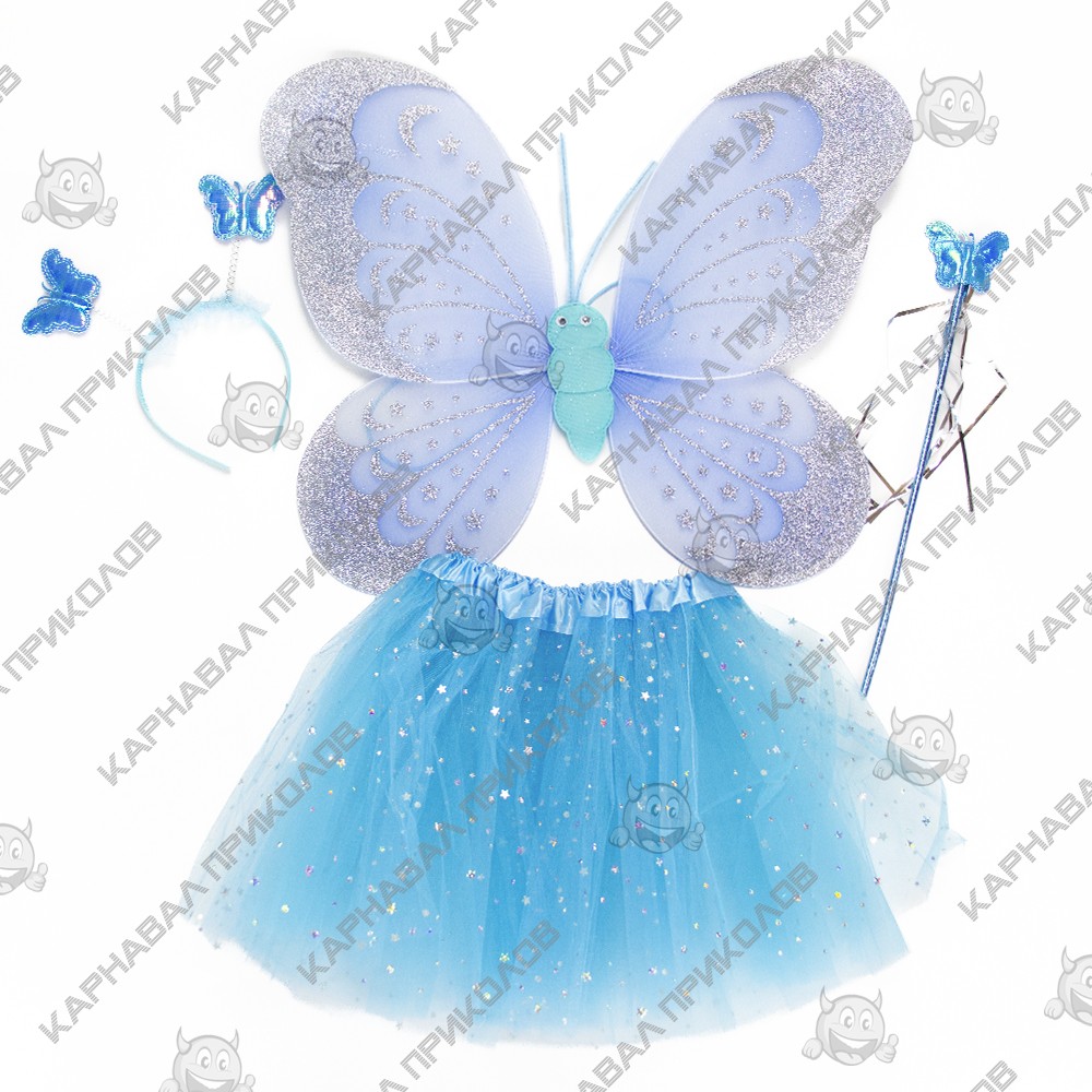| Додаткові характеристики: | Крила - 50х38см, спідниця з фатину: ширина в талії - 45 см, довжина спідниці - 30см, паличка: 35х7х1см, обідок: 22х21х1, 5см |
