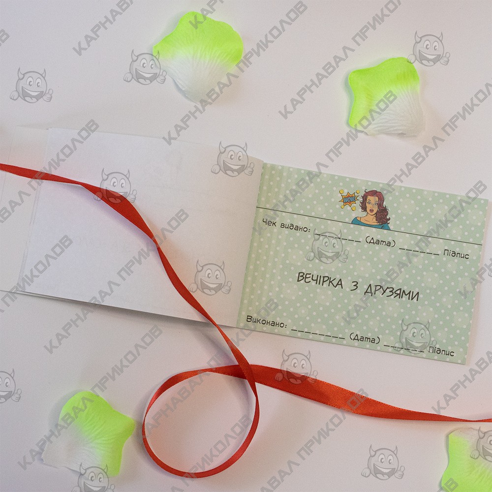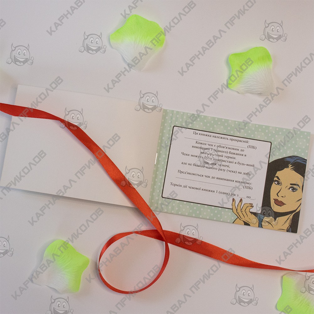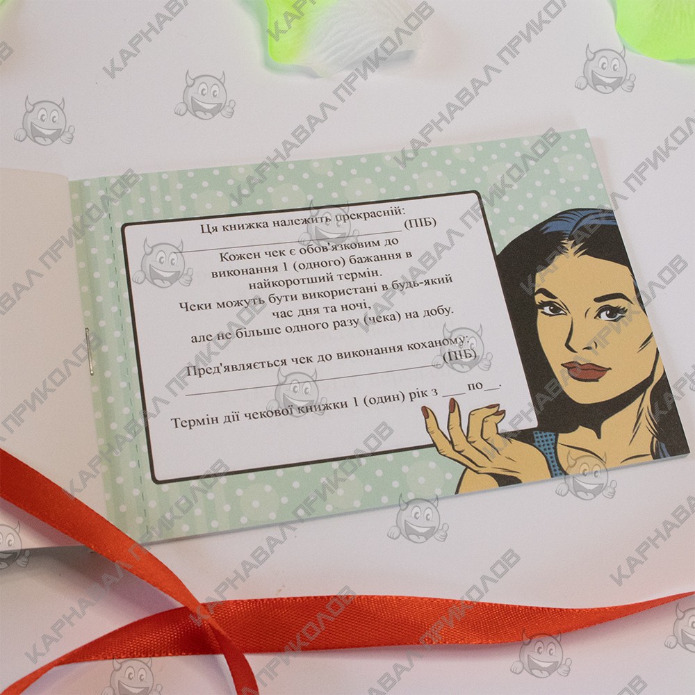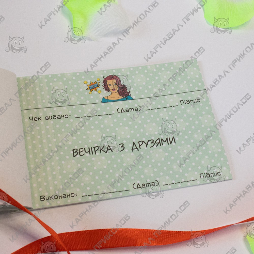 Чековая книжка желаний ДЛЯ КОХАНОЇ (укр. ) – найдорожчий подарунок, тому що Ви даруєте найбезцінніші речі Любов та Увага. Це чудовий та незабутній подарунок на будь-яке свято для Вашої половинки. З подарунком Чековая книжка желаний ДЛЯ КОХАНОЇ (укр. ) Ви зобов'язуєтесь виконати 15 простих, але в той же час дуже приємних квестів чи бажань вашої дівчини у встановлений період. Книга складається з 16 сторінок, сторінки з детальною інструкцією з використання та 15 дизайнерських купонів з бажаннями все російською мовою. Наприклад – сніданок у ліжко, 100 поцілунків, приватний танець та багато інших. Ваша кохана вибирає купон з бажанням, а Ви маєте його виконати. На додаток чековій книжці Ви можете придбати солодкий сюприз та оригінальний подарунок 100 та Одна Причина у нашому інтернет магазині Карнавал Приколів. Купивши Чековая книжка желаний ДЛЯ КОХАНОЇ (укр. ), ви отримуєте не тільки якісний товар, а й 100% позитивних вражень від придбання.