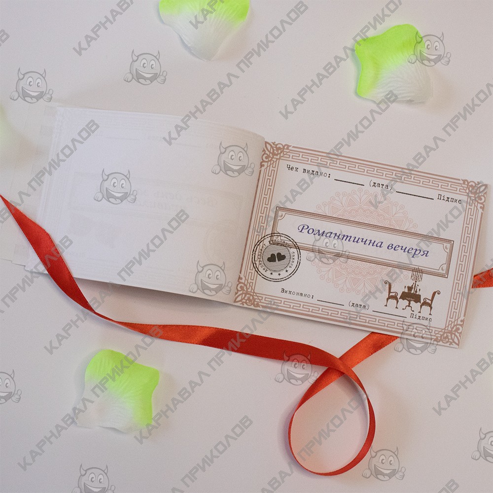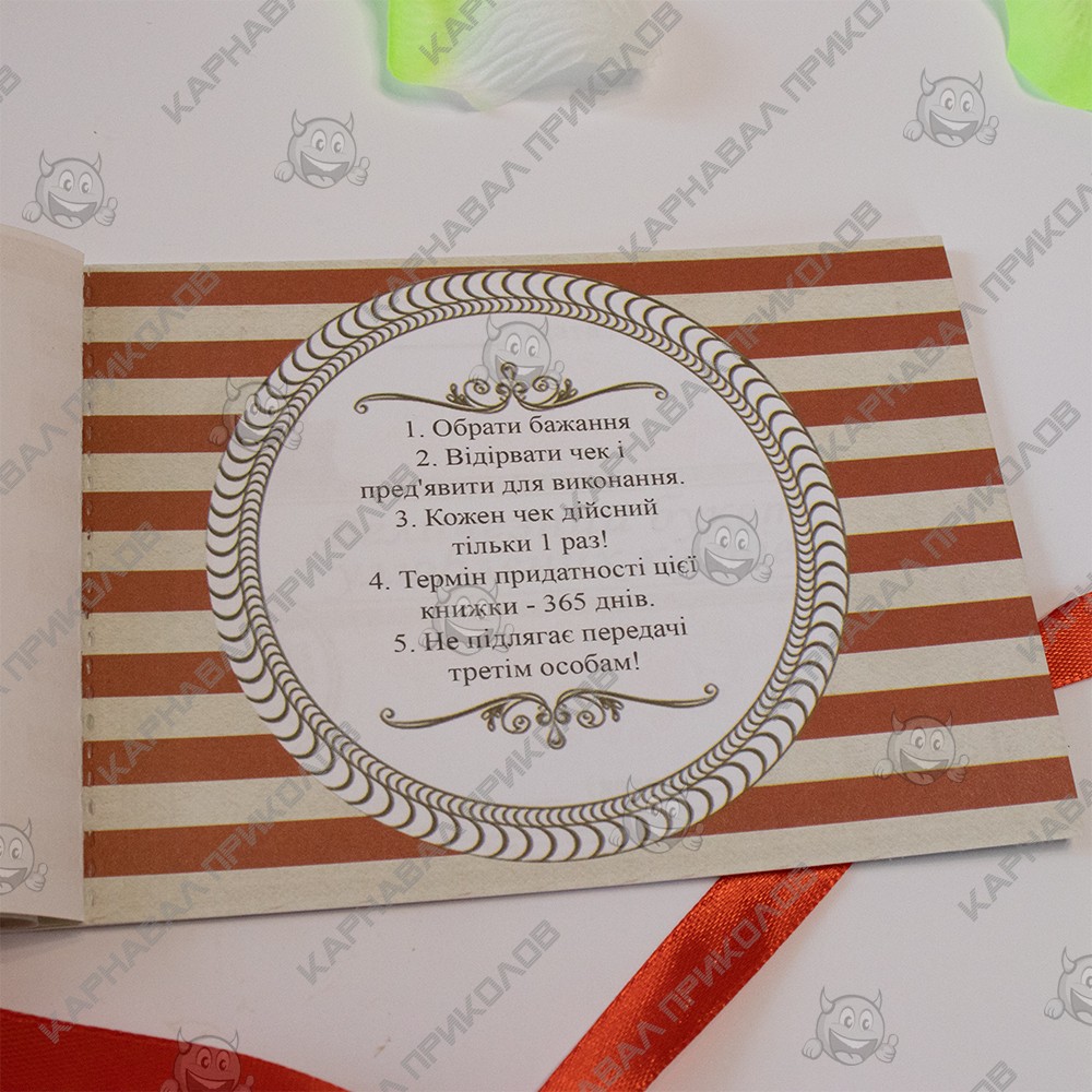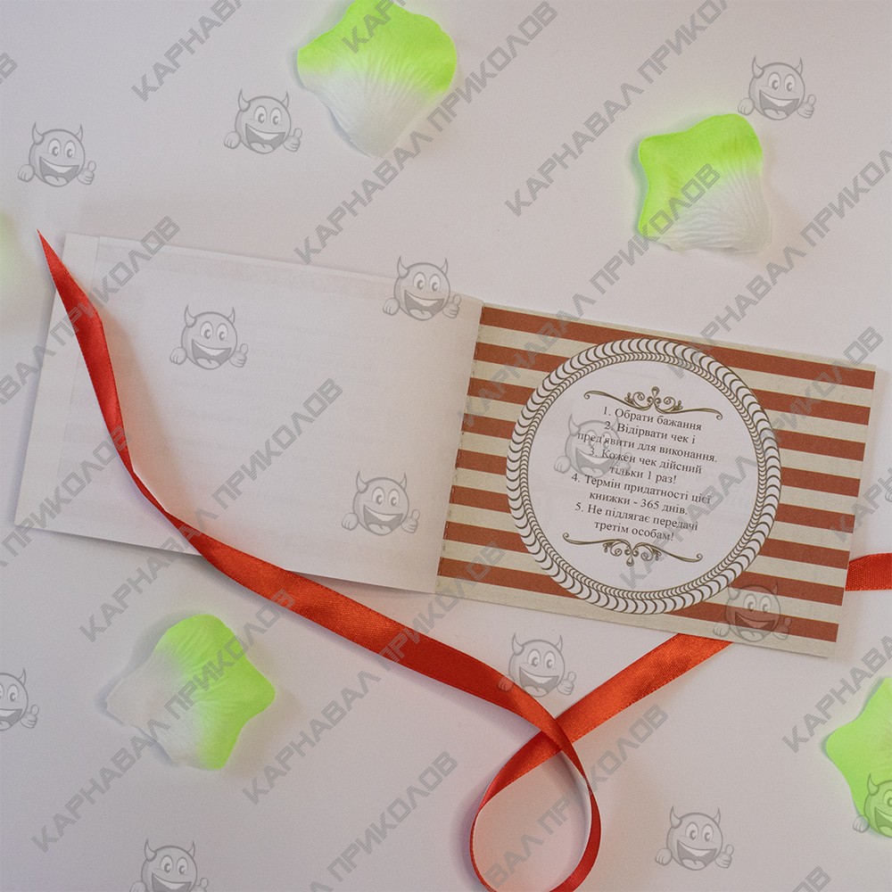 Чекова Книга Бажань – найдорожчий подарунок, тому що Ви даруєте найбезцінніші речі Любов та Увага. Це чудовий та незабутній подарунок на будь-яке свято для Вашої половинки. З подарунком Чекова Книга Бажань Для неї (укр. ) )ви зобов'язуєтесь виконати 15 простих, але в той же час дуже приємних квестів або бажань вашої дівчини у встановлений період. Книга складається з 16 сторінок, сторінки з детальною інструкцією з використання та 15 дизайнерських купонів з бажаннями все російською мовою. Наприклад - півгодинний масаж, будь-яке бажання, приємний сюрприз та багато інших. Ваша кохана вибирає купон з бажанням, а Ви маєте його виконати. На додаток чековій книжці Ви можете придбати солодкий сюприз та оригінальний подарунок 100 та Одна Причина у нашому інтернет магазині Карнавал Приколів. Купивши Чекову Книжку Бажань Для неї (укр. ) ви отримуєте не тільки якісний товар, а й 100% позитивних вражень від придбання.