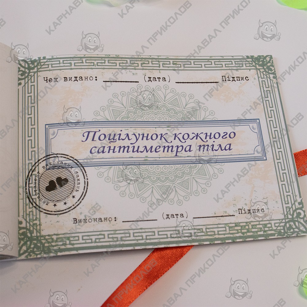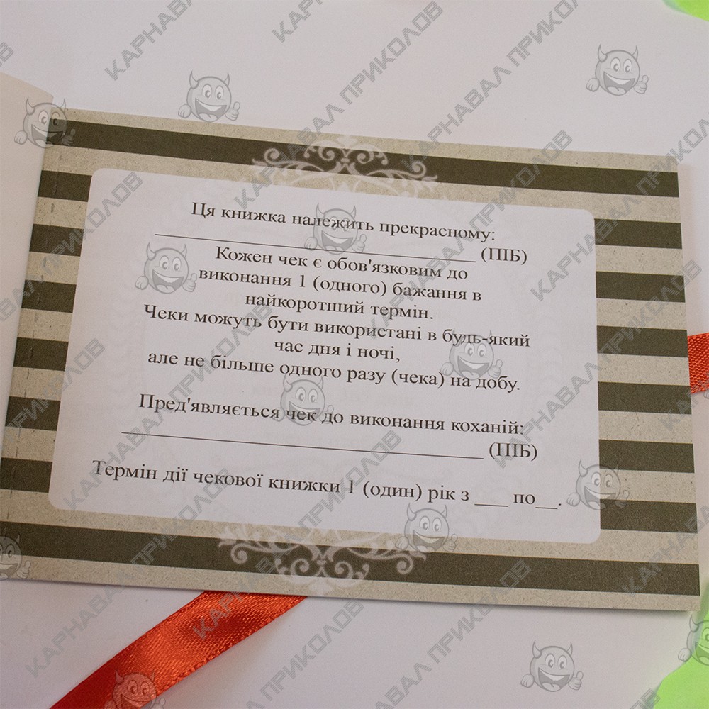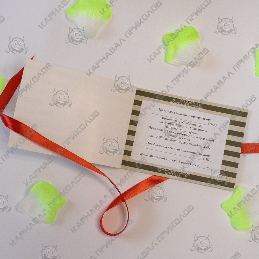 Чекова Книга Бажань – найдорожчий подарунок, тому що Ви даруєте найбезцінніші речі Любов та Увага. Це чудовий та незабутній подарунок на будь-яке свято для Вашої половинки. З подарунком Чековая книжка желаний ДЛЯ НЬОГО (укр. ) Ви зобов'язуєтесь виконати 15 простих, але в той же час дуже приємних квестів або бажань вашого хлопця у встановлений період. Книга складається з 16 сторінок, сторінки з детальною інструкцією з використання та 15 дизайнерських купонів з бажаннями все російською мовою. Наприклад – кава в ліжко, поцілунок кожного сантиметра тіла, еротичний масаж та багато інших. Ваш улюблений вибирає купон з бажанням, а Ви маєте його виконати. На додаток чековій книжці Ви можете придбати солодкий сюприз та оригінальний подарунок 100 та Одна Причина у нашому інтернет магазині Карнавал Приколів. Купивши Чековая книжка желаний ДЛЯ НЬОГО (укр. ) ви отримуєте не лише якісний товар, а й 100% позитивних вражень від придбання.