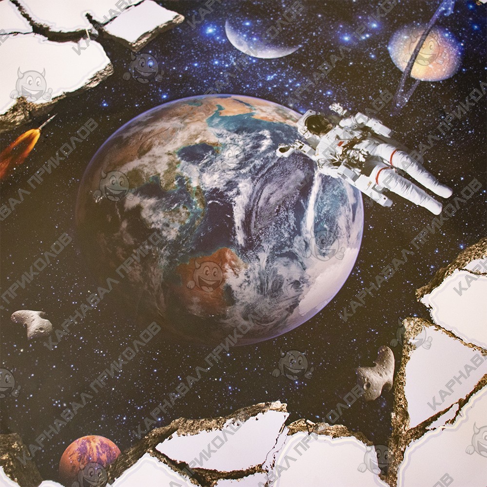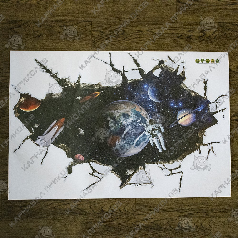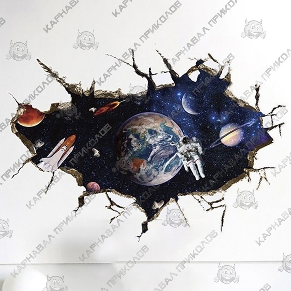 Інтер'єрна наклейка SS Космос Універсум SK9066A 90х60см – це швидкий спосіб класно прикрасити свій будинок. Інтернет-магазин Карнавал Приколів пропонує Вам купити інтер'єрні наклейки космічної тематики, які ідеально підійдуть на кухню, спальню, вітальню, дитячу чи ігрову кімнату. Прикрасу на стіну оцінять діти у своїх спальнях чи ігрових кімнатах. Інтер'єрна наклейка SS Космос Універсум SK9066A 90х60см принтом дірка у стіні у космос. Розмір листа з наклейками: 60х90 см. Як 3D наклейка клеїться на стіну? Спосіб поклейки дуже простий. Для початку потрібно очистити поверхню, на яку потрібно наклеїти. Після цього знімаємо плівку і переносимо малюнок на стіну або іншу площину рукою або ганчіркою. На які поверхні можна клеїти інтер'єрну наклейку? Поклейка можлива на будь-яку ІДЕАЛЬНО ГЛАДКУ ГЛЯНЦЕВУ поверхню, наприклад: стіна пофарбована глянсовою фарбою без будь-яких рельєфів (у фарбі не повинно бути крейдяного компонента), скло, дзеркало, лаковані поверхні, гладкий пластик. На шпалери клеїти НЕ МОЖНА. Доглядати стікери на стіну також досить легко, для цього необхідно лише іноді протирати їх вологою губкою або ганчіркою. Яскравість і насиченість наклейок не змінюється з часом, крім того, вони абсолютно стійкі до вологості.