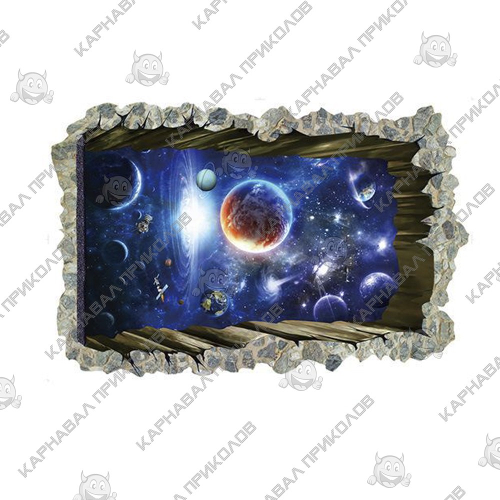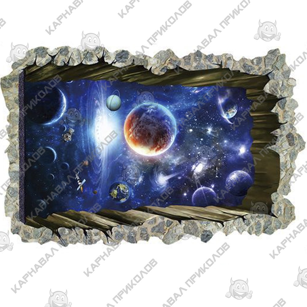 Інтер'єрна наклейка SS Космос Вікно у галактику SK9304N 90х60см– це швидкий спосіб класно прикрасити свій будинок. Інтернет-магазин Карнавал Приколів пропонує Вам купити інтер'єрні наклейки космічної тематики, які ідеально підійдуть на кухню, спальню, вітальню, дитячу чи ігрову кімнату. Прикрасу на стіну оцінять діти у своїх спальнях чи ігрових кімнатах. Інтер'єрна наклейка SS Космос Вікно у галактику SK9304N 90х60см принтом дірки крізь стіну у космос. Розмір листа з наклейками: 60х90 см. Як 3D наклейка клеїться на стіну? Спосіб поклейки дуже простий. Для початку потрібно очистити поверхню, на яку потрібно наклеїти. Після цього знімаємо плівку і переносимо малюнок на стіну або іншу площину рукою або ганчіркою. На які поверхні можна клеїти інтер'єрну наклейку? Поклейка можлива на будь-яку ІДЕАЛЬНО ГЛАДКУ ГЛЯНЦЕВУ поверхню, наприклад: стіна пофарбована глянсовою фарбою без будь-яких рельєфів (у фарбі не повинно бути крейдяного компонента), скло, дзеркало, лаковані поверхні, гладкий пластик. На шпалери клеїти НЕ МОЖНА. Доглядати стікери на стіну також досить легко, для цього необхідно лише іноді протирати їх вологою губкою або ганчіркою. Яскравість і насиченість наклейок не змінюється з часом, крім того, вони абсолютно стійкі до вологості.
